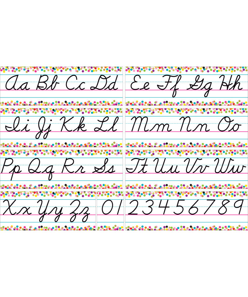 Display the alphabet and numbers 0–9 as a handy reference for young students. The 4-page teacher's guide includes writing tips. Includes 9 panels for over a 17-foot long alphabet line. Each 4-letter panel is 23-1/2" x 7-1/2".