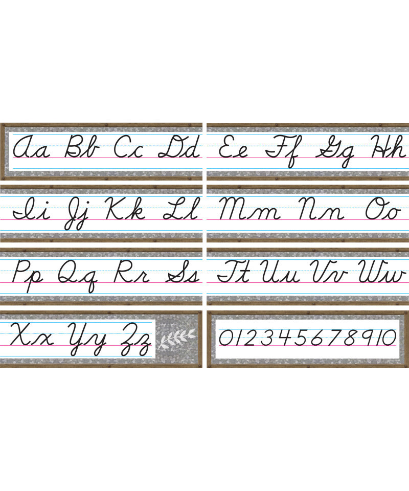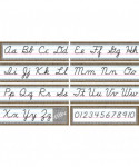 Display the Home Sweet Classroom Cursive Mini Bulletin Board alphabet and numbers 0-10 as a handy reference for young students. The 4-page teacher's guide includes writing tips and a reference chart that diagrams the steps in writing each letter. Includes 8 panels for a 14-foot long alphabet line. Shiny, protective coating adds durability. This product is acid-free per industry standards. Each piece is 21" x 6".