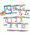 Decorate as you educate with this easy-to-read alphabet line. Includes a frame and arrow that can be used to highlight a letter of the day. Includes numbers 0-10. Also includes a teacher's guide with suggested activities. Each 3-letter panel is 17-1/2" x 7-1/2". 14 total pieces.