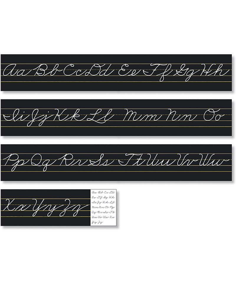 This product features Traditional Cursive typeface on a rich black background with yellow ruled lines demonstrating proper letter formation. Professionally printed educational alphabet strips, crafted with high quality materials for durability and visual clarity. Make learning more enjoyable with vivid colors, eye-catching images and educational content tailored to many grade levels. Includes 7 strips measuring 24.25" x 7.625".