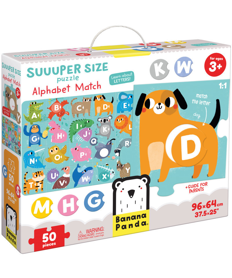 A is for alligator! B is for? What letter does tiger start with? Learn the alphabet with these fun-loving animals! Suuuper size educational puzzles provide hours of fun for you and your child and can be played in many ways depending on your child's age. You can start with one animal and match it with the right letter. Gradually increase the number of puzzles and complete the whole set. Use the animal pieces with mix-and-match letters for lots of educational fun. You can find our game suggestions in the guide included with this set.