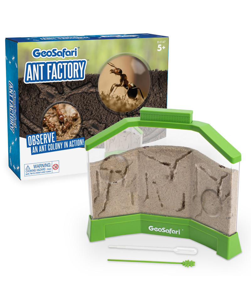 Explore the amazing world of ants up close with the GeoSafari Ant Factory – with sand! Set includes everything kids need to raise and observe an ant colony, including an escape-proof ant habitat with large viewing area, magnification spots, and stand; special ant sand; feeding tool, and certificate to receive live ants. Settle your ants and watch as they work together to tunnel, eat, sleep, and more. Perfect for young entomologists; provides a 360°-view of one of the world's most industrious insects! Includes activity guide and mail-in certificate for Harvester Ants ($4.00 shipping and handling not included).
