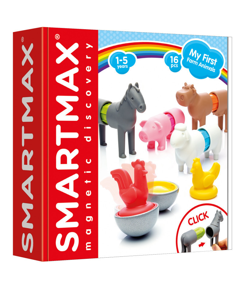 Young children can safely discover the magic of magnetism with the SMARTMAX® "My First" collection. More magnetic fun with My First Farm Animals! Build a horse, cow, sheep, chicken or rooster.. Or mix and Match! Contents: 4 Smartmax Bars, 2 cow pieces, 2 horse pieces, 2 pig pieces, 2 sheep pieces, 1 Rooster, 1 Hen, and 2 Bases.