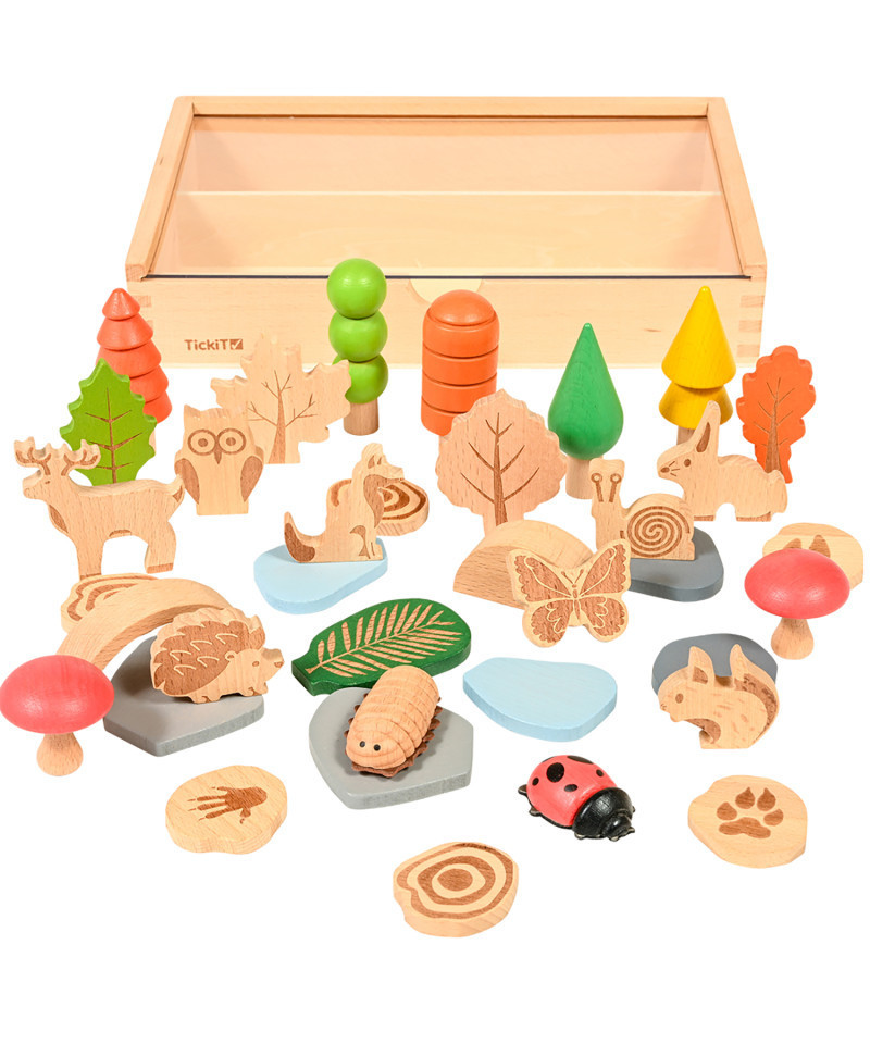 This set features an assortment of 37 woodland shapes. Create relaxing small worlds with little critters, stones, trees and more. These wooden toys are perfect for open-ended, creative play. Use descriptive language to explore storytelling and world-building. All the pieces feature a smooth, natural wood grain to promote comfort and relaxation. Some pieces are designed with added indents and textures. Made with durable beechwood, this set is designed to last for years of play. Use the wooden box and clear acrylic lid for easy cleanup and storage. Add this set to calming corners, playrooms and sensory bins. Includes: 5 trees, 5 leaves, 2 minibeasts, 2 toadstools, 6 stones and water shapes, 6 log slices with animal footprints on the reverse side, a 2-piece bridge arch, and a wooden box with a clear acrylic lid. For ages 3+. Size of tray: 10.6"H x 7.3"L. Size range: 1.5"H x 1.5"L - 2.4"H x 2.1"L.