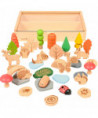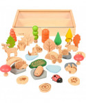- 37 NATURAL WOODEN FIGURINES -- This set features an assortment of 37 woodland shapes. Create elaborate small worlds with little critters, mushrooms, stones, trees, water pieces and more.