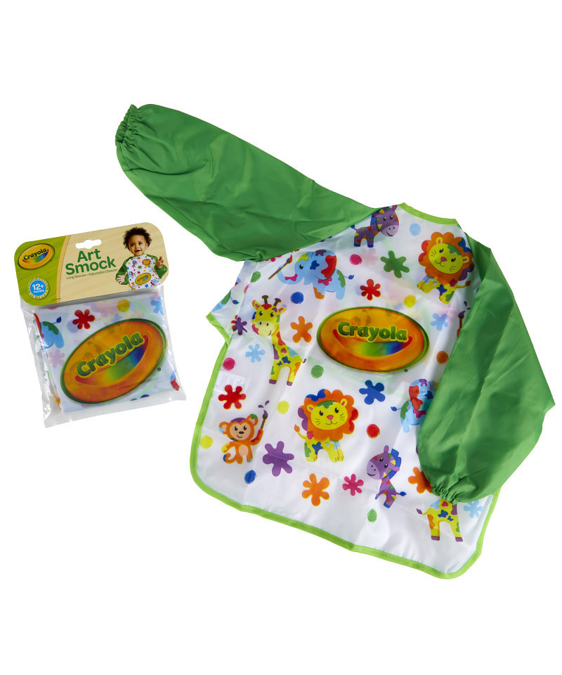 - The reusable My First Crayola Art Smock includes elastic cuffs with sleeves and adjustable Velcro straps for a universal fit and easy clean up
