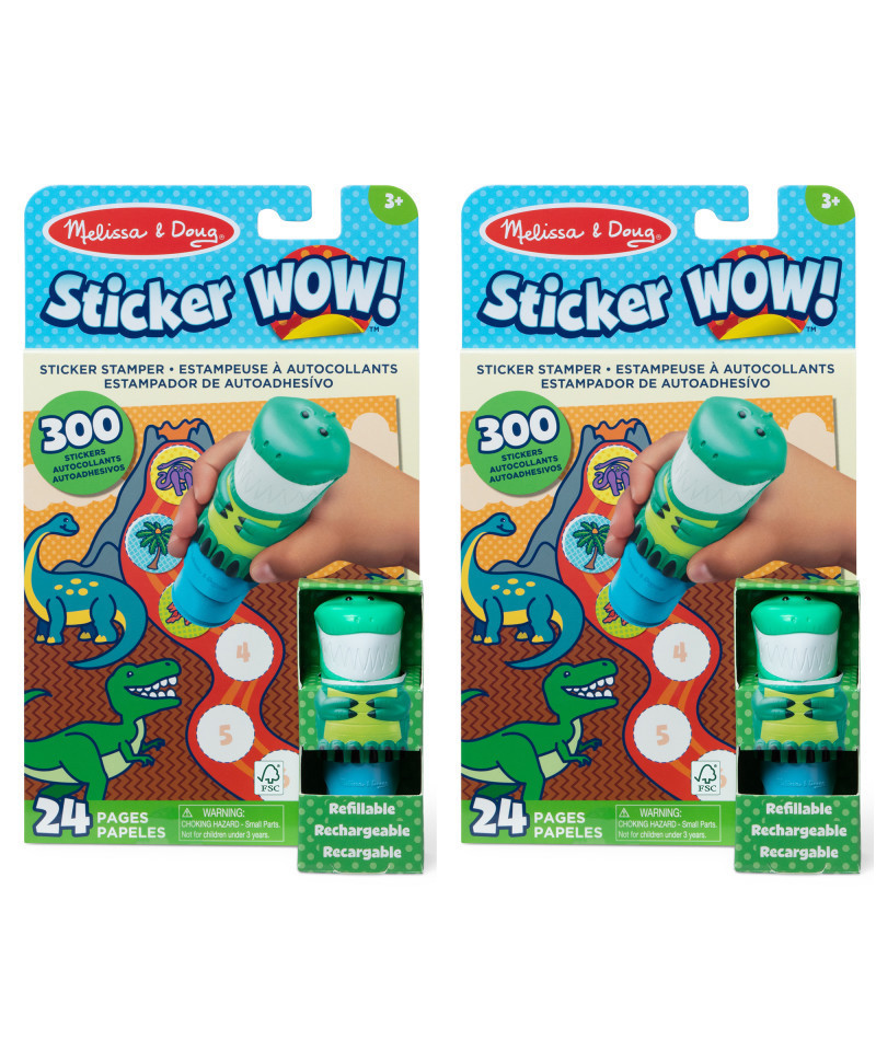 Melissa & Doug Sticker WOW!™ is a whole new way to play with stickers! Let the adorable, collectible Olive the Dinosaur stamp, stamp, stamp its way through 24 pages of fun-filled, prehistoric-themed counting, matching, and search-and-find activities. The refillable sticker stamper comes pre-loaded with a sticker stack of 300 assorted stickers – with 100 unique designs in every stack, each sticker is a surprise! Themed refill packs are sold separately and are compatible with any Sticker WOW!™ sticker stamper. Stickers are not reusable, but are easy to remove if necessary. Fill in the activity pages and use for creative art projects, such as bookmarks, posters, cards, and more. Easy-to-remove stickers and the convenient on-the-go format with built-in sticker stamper storage makes Sticker WOW!™ (patent pending) a great mess-free travel activity. Sticker WOW!™ promotes fine motor skills, encourages creative play, and it's satisfying, fidget fun! Sold as a pack of 2 complete activity pad sets.