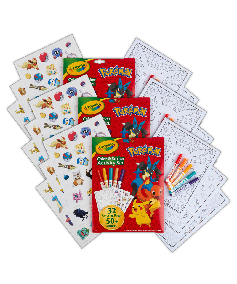 Little ones will love to color and decorate their favorite characters from Pokémon! Each Crayola Color & Sticker Activity Set offers 32 Coloring Pages, 5 Crayola Pipsqueak Markers, and 3 Sticker Sheets featuring Ash, Pikachu, and all their friends. There are over 50 stickers included in each set so kids can enhance their coloring artwork of their favorite Pokémon Partners! The folder-style design keeps coloring pages safe and organized for on-the-go entertainment or rainy days at home, so fans can color the adventures of Ash, Goh, Pikachu, Sobble, and friends wherever they roam! This Crayola Color & Sticker Activity Set comes with everything kids need to get started creating. A great gift for boys and girls who love the Pokémon Series. Safe and nontoxic, ages 3 and up. Sold as a pack of 3 complete activity sets.