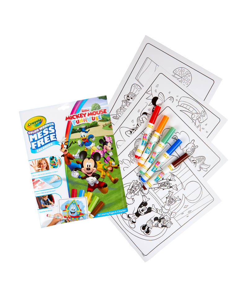 Kids can color the leader of the club, Mickey, and all of his clubhouse pals in a mess-free way with Crayola Color Wonder! Color Wonder colors appear only on special Color Wonder paper, not on skin, clothing, or carpets. This set contain 18 fun-filled coloring pages depicting scenes featuring characters from the Mickey Mouse Clubhouse and more! Each page works with all Color Wonder markers, paints and stamps. The convenient "foldalope" packaging works as reusable storage for your coloring pages and markers. Includes 18 Mickey Mouse Clubhouse pages and 5 Color Wonder Markers. Makes a great gift for girls and boys ages 3 and up!