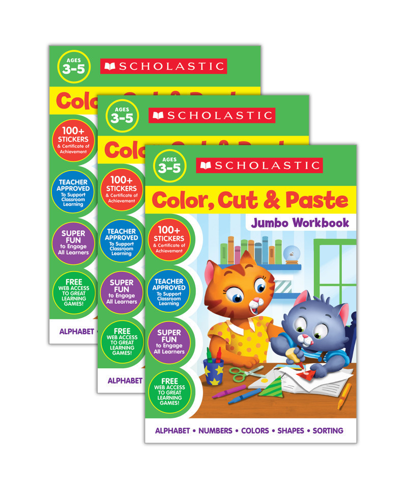 Building fine-motor skills is a blast with this big collection of coloring, cutting, and pasting pages! These kinesthetic activities reinforce alphabet awareness, numbers, colors, shapes, sorting, and more! Includes easy craft projects and motivating stickers. A super way to get little learners all set for school! Sold as a pack of 3 workbooks.