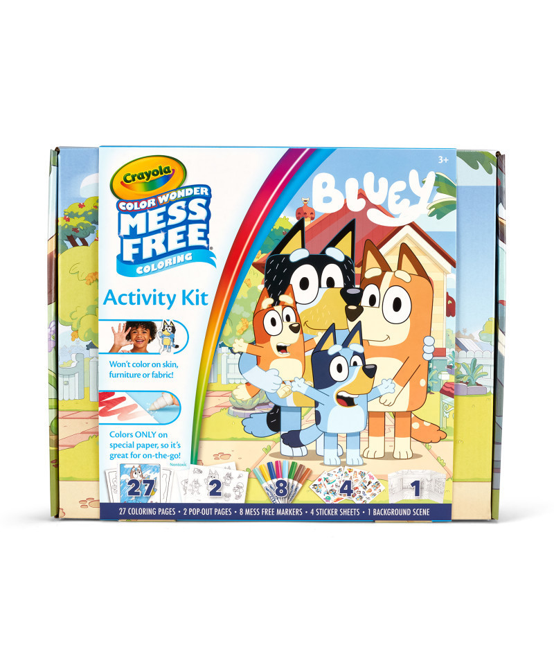 Experience a whole new level of imaginative play with the Bluey Color Wonder Activity Kit by Crayola. This enchanting set, bustling with fan-favorite preschool character Bluey and buddies, lets your little one immerse themselves in a world of vibrant colors! Featuring 27 spacious 8" x 10" coloring pages — each filled with captivating scenes, it offers endless opportunities to unleash their artistic flair. This unique kit isn't just for coloring; it's a gateway to creative role-play. With 2 diecut cardstock pop-out characters and a trifold background, kids can explore multidimensional play, forging memorable tales with their colored characters! But the fun doesn't stop there. Our mess-free markers ensure worry-free coloring, liberating young creators from the fear of stains or spills. Top off their masterpieces with a shimmery touch using the 4 metallic sticker sheets. Embrace a unique blend of interactive and mess-free fun that nurtures an early love for art. Suitable for ages 3 and up, the Bluey Color Wonder Activity Kit guarantees comfort and fun in a single package.