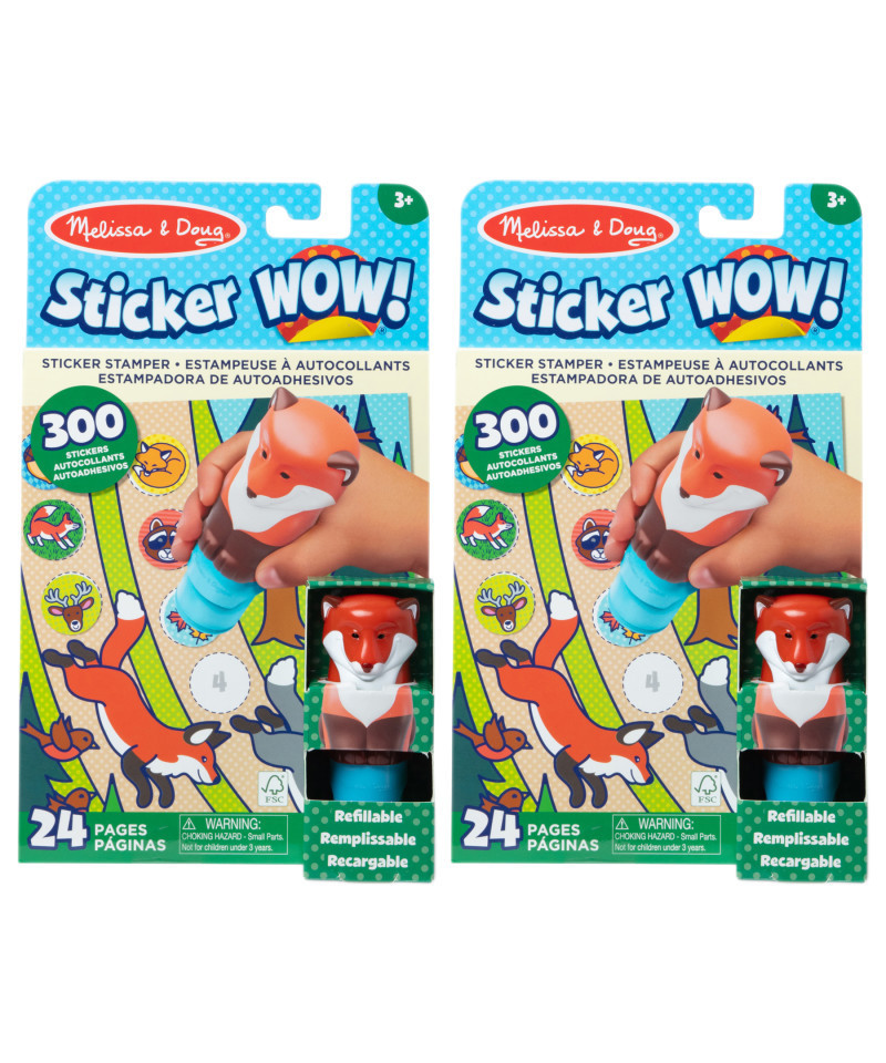 Melissa & Doug Sticker WOW!™ is a whole new way to play with stickers! Let the adorable, collectible Pepper the Fox stamp, stamp, stamp its way through pages of fun-filled, woodland-themed counting, matching, and search-and-find activities. The refillable sticker stamper comes pre-loaded with a sticker stack of assorted stickers – with 100 unique designs in every stack, each sticker is a surprise! Themed refill packs are sold separately and are compatible with any Sticker WOW!™ sticker stamper. Stickers are not reusable, but are easy to remove if necessary. Fill in the activity pages and use for creative art projects, such as bookmarks, posters, cards, and more. Easy-to-remove stickers and the convenient on-the-go format with built-in sticker stamper storage makes Sticker WOW!™ (patent pending) a great mess-free travel activity. Sticker WOW!™ promotes fine motor skills, encourages creative play, and it's satisfying, fidget fun! Each set includes 1 Sticker Stamper With 300 Stickers and one 24-Page Activity Pad. Sold as a pack of 2 complete activity pad sets.