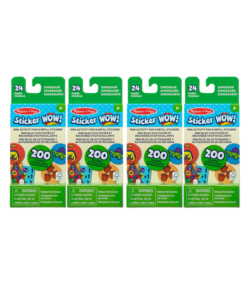 Melissa & Doug Sticker WOW!™ is a whole new way to play with stickers! Pop the convenient sticker stack of assorted dinosaur stickers into any Sticker WOW!™ Sticker Stamper cartridge (sticker stamper not included), and stamp, stamp, stamp through mini pages (approximately 2.25 by 4.25 inches) of fun-filled prehistoric-themed counting and matching activities. With 100 unique designs in the sticker stack, each sticker stamped is a surprise. Sticker WOW!™ refill stickers are not reusable but are easy to remove if necessary and are great for creative arts and crafts projects. Dinosaur refill stickers are a natural complement to the Dinosaur Sticker WOW!™ sticker stamper, but they are compatible with all the cute and collectible Sticker WOW!™ sticker stampers. Sticker WOW!™ (patent pending) promotes fine motor skills, encourages creative play, and it's satisfying, fidget fun! Each set includes one 24-Page Mini Pad and 200 Stickers. Sold as a pack of 4 complete activity pad sets.