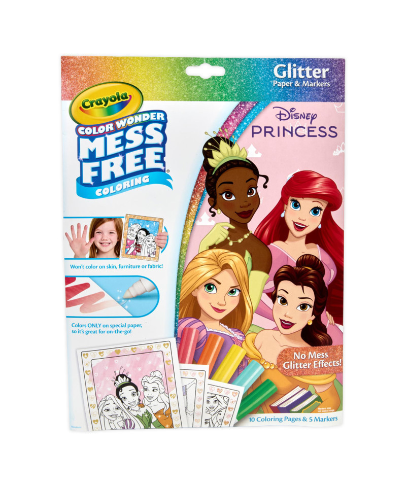 Add Sparkle to Your Art with the Crayola Disney Princesses Color Wonder Glitter Set! This innovative product brings the magic of glitter without the mess, as the glitter effects are seamlessly integrated into the Color Wonder Paper. Simply use the clear Color Wonder Markers to create vibrant, shimmering masterpieces. The markers are designed to only work on Color Wonder Paper, ensuring they won't stain skin, furniture, or carpets. Folder-style packaging works as reusable storage for your coloring pages and markers. This makes it the perfect art activity for on-the-go creativity or any place where mess is a concern. The kit includes 10 glitter paper coloring pages showcasing beloved Disney Princess characters and 5 Color Wonder markers. Experience the joy of mess-free art for toddlers and let your creativity shine with Color Wonder and Disney Princesses! Safe & nontoxic, this Disney Princess coloring set makes a great gift for toddler stocking stuffers, Easter baskets, or every day gifting.