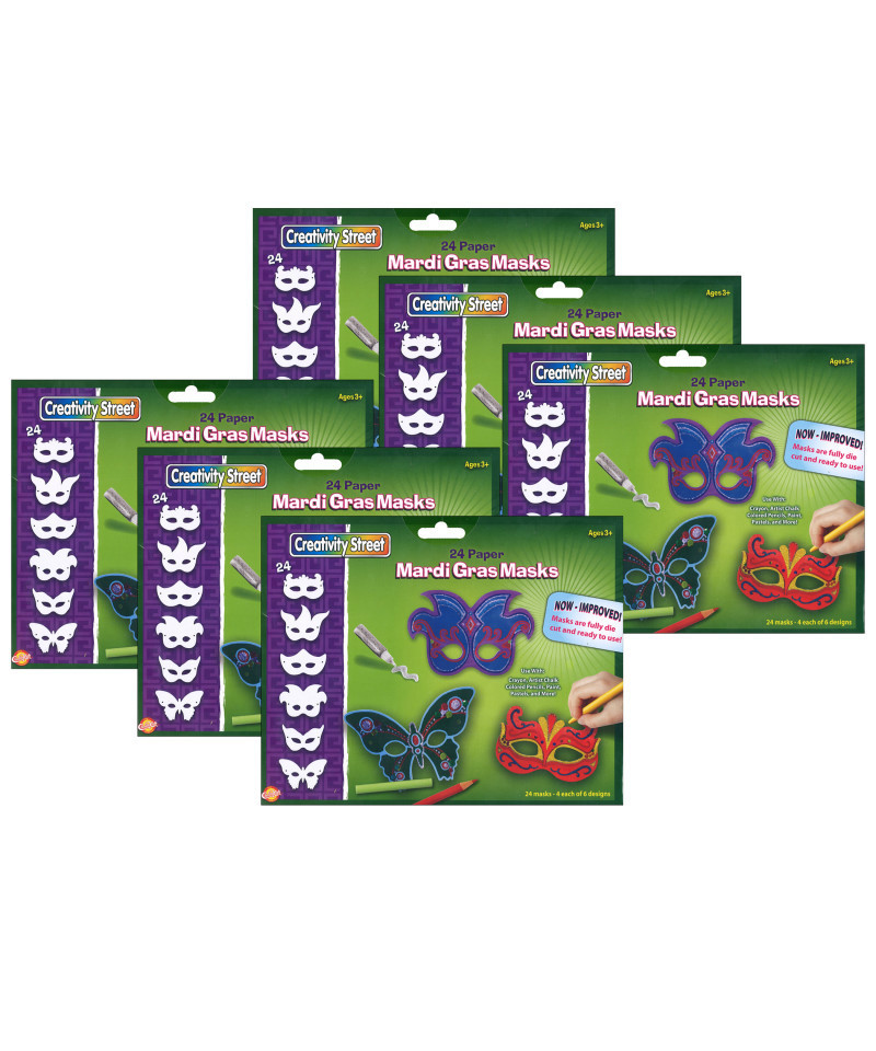 Our affordable masks come in a convenient 24 pack and feature 6 different designs. Enough for the whole class - or a party! Paper masks are die cut and ready to decorate with paint, colors markers, glitter, gems, feathers & more. Once the masks are decorated and allowed to dry simply add elastic or string and they are ready to wear! Each pack contains 24 masks. Sold as 6 packs for a total of 144 masks. Ages 4 and up.
