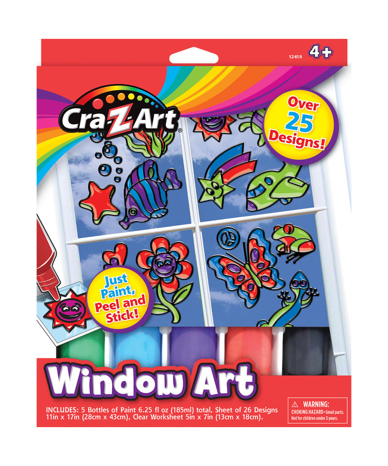 Window art Decorative design DIY kit by Cra-Z-Art! Unleash your creativity and transform your windows, mirrors, and other glass surfaces into works of art with this Super cool arts and crafts kit! With over 25 designs, this kit makes for the perfect rainy-day craft or group activity. Paint, peel and stick to your windows! This is the ultimate arts and crafts kit for any child who loves to paint, draw, or decorate. Another awesome alternative for wall art. Can be easily taken off windows and replaced with new Window art at any time! It is also a great way for your children to be creative and use their imagination! After creating unique works of art don't forget to go outside and check out the results! This Cra-Z-Art window art kit is a great gift for children ages 6 and up. Super easy and fun to do!