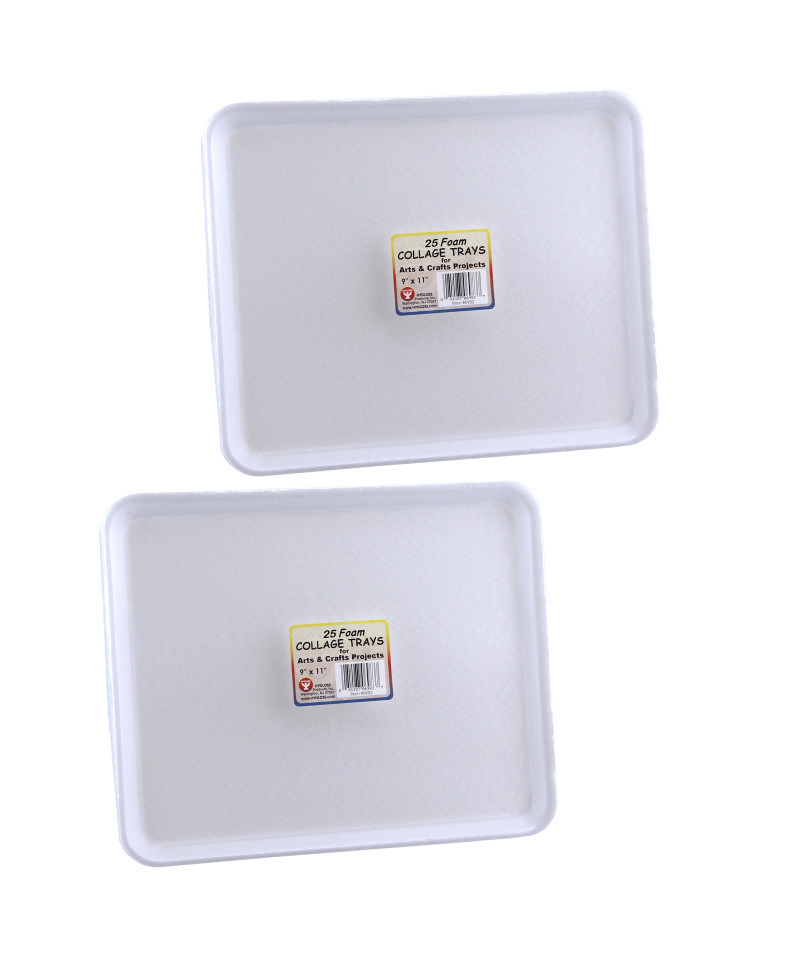 These white foam trays are the perfect backgrounds for your works of art. Bulky craft materials like buttons, gravel, or sea shells often need a sturdy surface, and these collage trays will do the trick! Create stunning artwork using some glue and any craft supplies you have on hand. The foam trays are also useful for handing out project supplies in a class or group setting. Each pack includes 25 trays. Sold as 2 packs for a total of 50 trays.