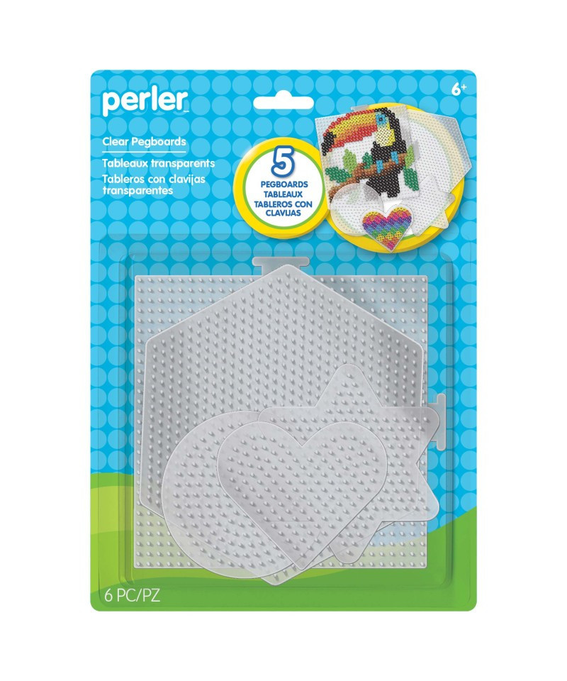 Our 5 Small & Large Basic Shapes Clear Pegboards are designed for use with Perler Beads. The advantage with clear pegboards is that you can lay them right over a pattern for easy placement of beads. For ages 6 and up. The Perler Small & Large Basic Shapes Clear Pegboard Set includes: large clear square pegboard (5.7" square), large clear hexagon pegboard (6.25" x 5.5"), small clear circle pegboard (3.3" diameter), small clear star pegboard (3.5" x 4"), small clear heart pegboard (3.4" x 2.8"), ironing paper, and easy instructions.