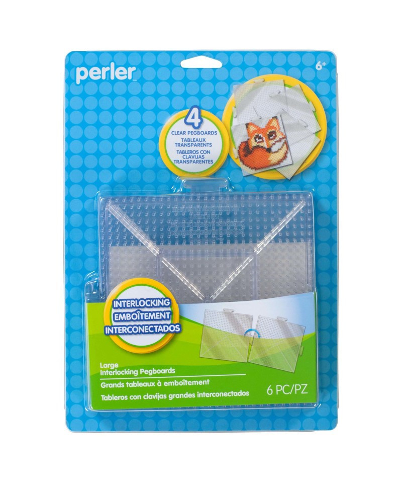 The Perler Large Clear Square Pegboards 4 Pack is perfect for creating larger than life projects and ideal for the multi pegboard projects on our website! Use it with our Perler Beads Snapshots web application and you can recreate just about any photo you may have. Simply place the pattern under the pegboard and follow along. The pegboards easily snap together to give you enough space to create incredible Perler masterpieces. Individually, the boards measure 5.7" square; when assembled together in a 4-square they measure 11.375" x 11.375". Ironing paper and instructions also included. For ages 6 and up.
