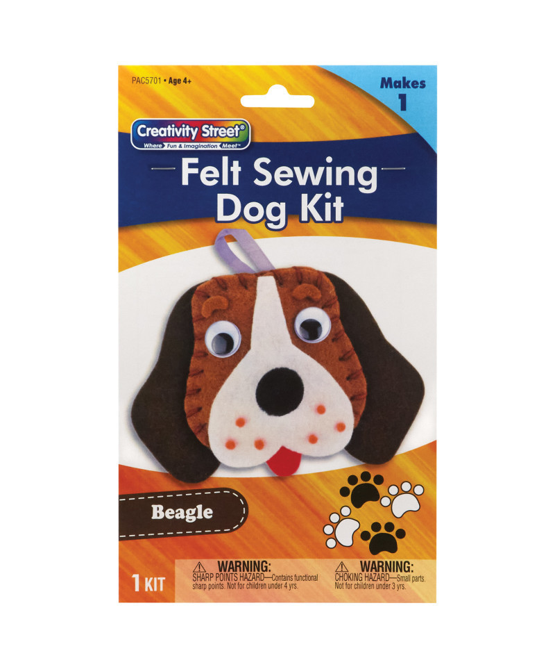 Take a break from screen time with fun and easy Creativity Street® Felt Sewing Dog Kits! This all-in-one solution is the perfect DIY project for kids! The convenient kit includes everything you need to create your very own adorable Beagle: pre-punched felt & felt shapes, stuffing, wiggle eyes, pom pons, ribbon, string and a plastic needle. All you need is glue and scissors, and you can create your new best friend! Estimated dimensions are 5"W x 5.5"L (including string) x 1"H/D. Please note, finished product dimensions will vary based on individual assembly.
