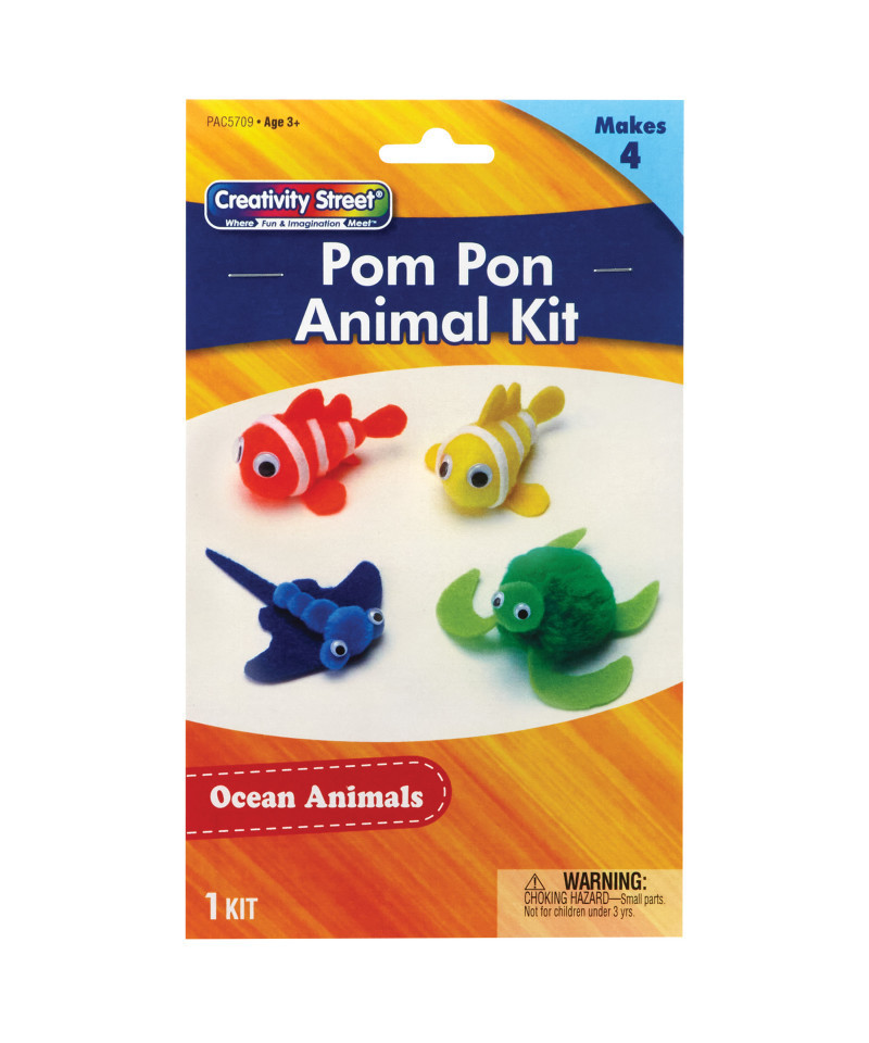 Take a break from screen time with fun and easy Creativity Street® Pom Pon Animal Kits! This all-in-one solution is the perfect DIY project for kids! The convenient kit includes everything you need to create four of your very own Ocean Animals: pre-cut felt shapes, wiggle eyes and pom pons. All you need is glue and scissors, and you can create an underwater ocean family! Please note, finished product dimensions will vary based on individual assembly. Estimated dimensions are as follows: