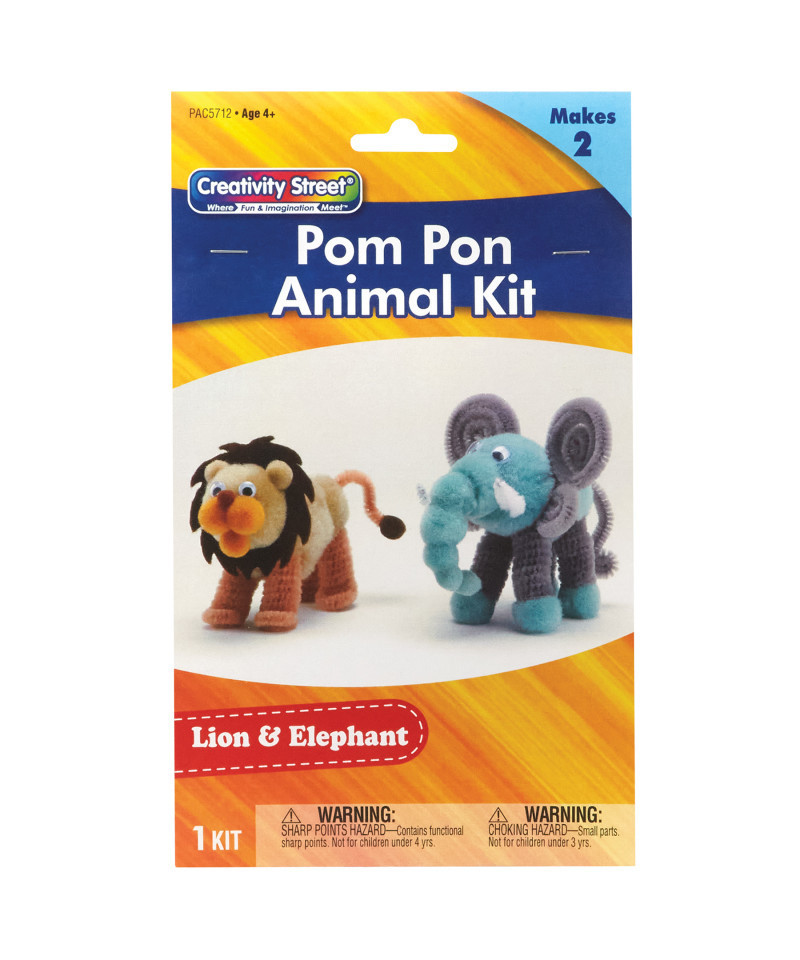 Take a break from screen time with fun and easy Creativity Street® Pom Pon Animal Kits! This all-in-one solution is the perfect DIY project for kids! The convenient kit includes everything you need to create an adorable Lion and Elephant: pre-cut felt shapes, wiggle eyes, chenille stems and pom pons. All you need is glue and scissors, and you can create your own little African safari animals! Estimated dimensions are as follows: Elephant: 3.75"W x 3.5"L x 3.5"H, Lion: 2"W x 4.25"L x 3"H. Please note, finished product dimensions will vary based on individual assembly.