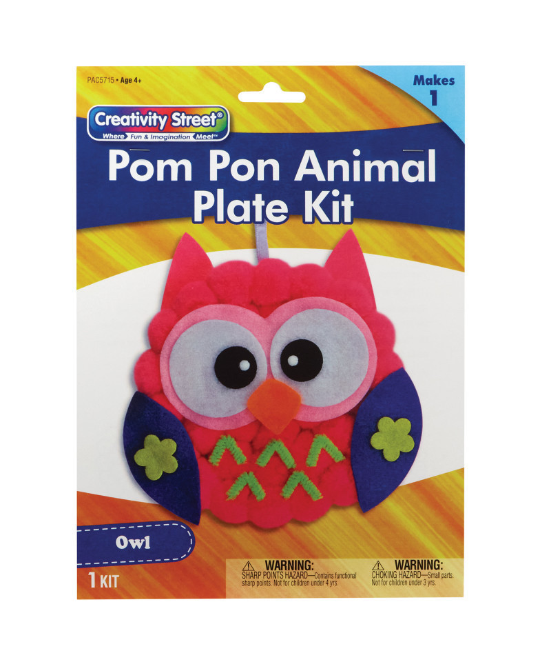 Take a break from screen time with fun and easy Creativity Street® Pom Pon Animal Plate Kits! This all-in-one solution is the perfect DIY project for kids! The convenient kit includes everything you need to create your very own adorable Owl: paper plate, pre-cut felt shapes, chenille stem, pom pons and ribbon. All you need is glue and scissors, and you can create your own wise little friend! Estimated dimensions are 7"W x 8"L (including string) x 1"H/D. Please note, finished product dimensions will vary based on individual assembly.