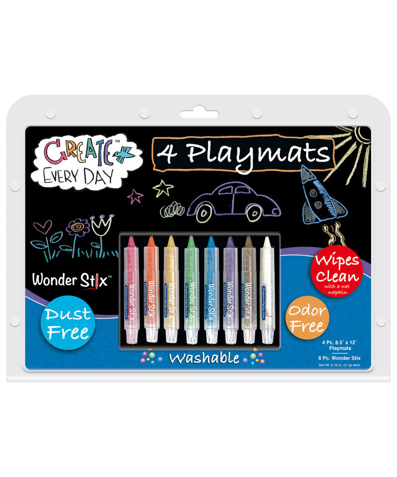 This set is great for travelling, play dates, dinner time, restaurants and more! Draw directly on the playmats, and remove with a damp cloth and start over and over again! Create everyday with this portable and mess free activity! Small kit includes (4) 8-1/2" x 12" playmats and (8) set of Wonder Stix.
