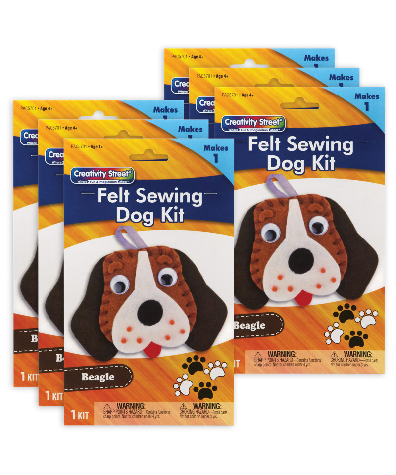 Take a break from screen time with fun and easy Creativity Street® Felt Sewing Dog Kits! This all-in-one solution is the perfect DIY project for kids! Each convenient kit includes everything you need to create your very own adorable Beagle: pre-punched felt & felt shapes, stuffing, wiggle eyes, pom pons, ribbon, string and a plastic needle. All you need is glue and scissors, and you can create your new best friend! Estimated dimensions are 5"W x 5.5"L (including string) x 1"H/D. Please note, finished product dimensions will vary based on individual assembly. Sold as a pack of 6 kits.