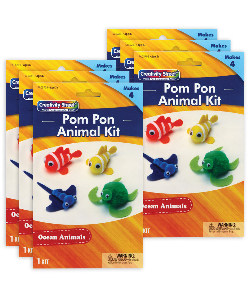 Take a break from screen time with fun and easy Creativity Street® Pom Pon Animal Kits! This all-in-one solution is the perfect DIY project for kids! Each convenient kit includes everything you need to create four of your very own Ocean Animals: pre-cut felt shapes, wiggle eyes and pom pons. All you need is glue and scissors, and you can create an underwater ocean family! Please note, finished product dimensions will vary based on individual assembly. Includes 4 animals per kit, sold as 6 kits, 24 animals total. Estimated dimensions are as follows: