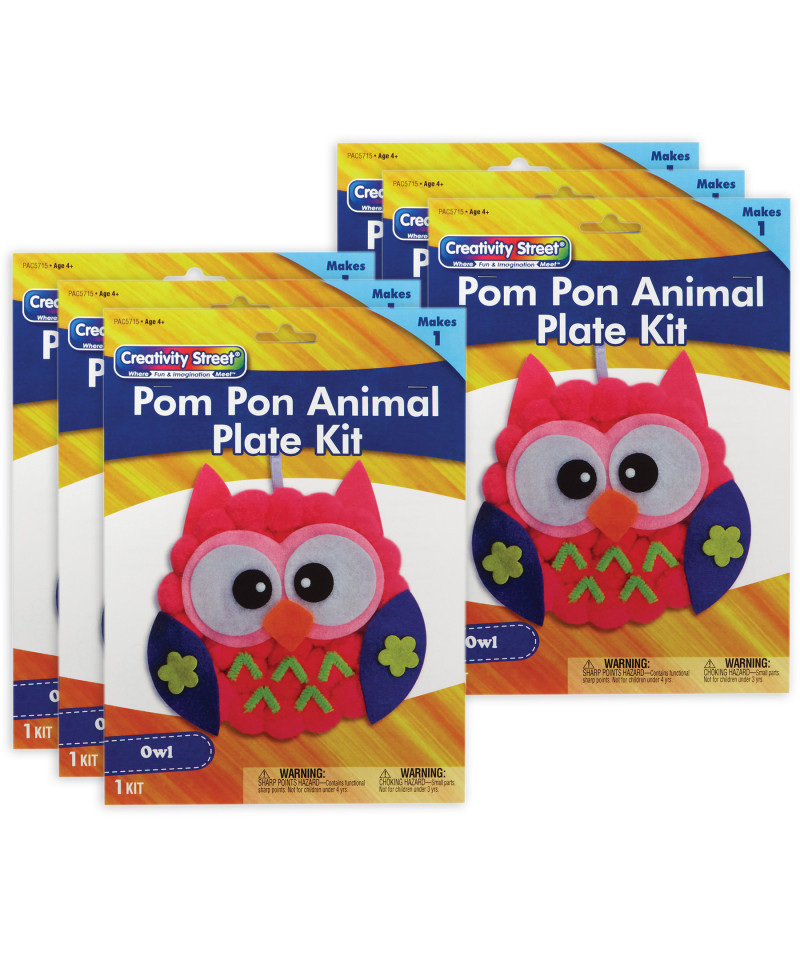Take a break from screen time with fun and easy Creativity Street® Pom Pon Animal Plate Kits! This all-in-one solution is the perfect DIY project for kids! Each convenient kit includes everything you need to create your very own adorable Owl: paper plate, pre-cut felt shapes, chenille stem, pom pons and ribbon. All you need is glue and scissors, and you can create your own wise little friend! Estimated dimensions are 7"W x 8"L (including string) x 1"H/D. Please note, finished product dimensions will vary based on individual assembly. Sold as a pack of 6 kits.