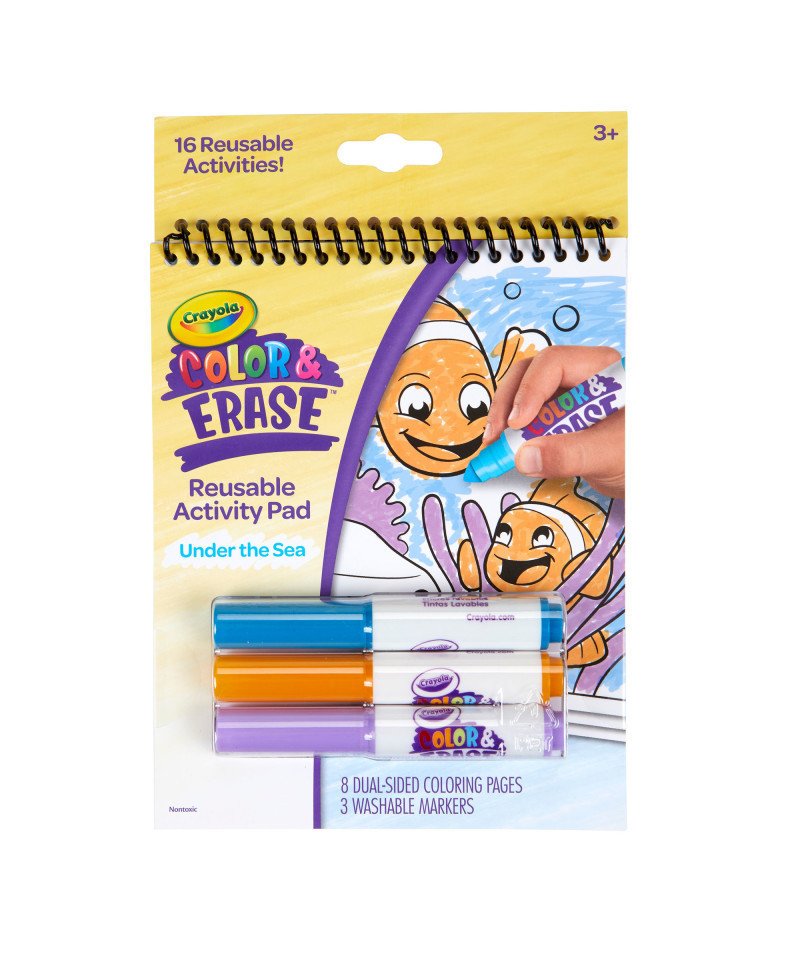Crayola Color & Erase Reusable Activity Pad: Under the Sea lets kids color delightful ocean-themed coloring pages with vibrant, washable markers. It's never been easier to color, wipe clean, and color again. This reusable activity pad is all parents need to give kids screen-free art time while traveling. Double-sided pages mean 16 different scenes to explore. All Crayola Color & Erase products offer less-mess art experiences that kids can create again and again! Each item in the line produces vibrant colors on surfaces that can be easily erased with a damp cloth. Each Activity Pad includes 8 Dual-Sided, Reusable, 5" x 7" Activity Pages and 3 Washable Markers. Safe and nontoxic, this set is the ideal practice-makes-perfect activity for young artists ages 3 and up.