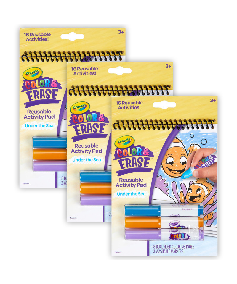 Crayola Color & Erase Reusable Activity Pad: Under the Sea lets kids color delightful ocean-themed coloring pages with vibrant, washable markers. It's never been easier to color, wipe clean, and color again. This reusable activity pad is all parents need to give kids screen-free art time while traveling. Double-sided pages mean 16 different scenes to explore in each activity pad. All Crayola Color & Erase products offer less-mess art experiences that kids can create again and again! Each item in the line produces vibrant colors on surfaces that can be easily erased with a damp cloth. Each Activity Pad includes 8 Dual-Sided, Reusable, 5" x 7" Activity Pages and 3 Washable Markers. Safe and nontoxic, this set is the ideal practice-makes-perfect activity for young artists ages 3 and up. Sold as a pack of 3 Activity Pads.