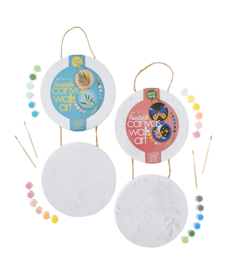 Art 101 Gallery Paint and Hang Paintable Canvas Wall Art includes everything you need for the perfect piece of hanging art! This Two Pack comes with two designs, each with 2 circle canvases on rope with beautiful trendy designs for you to paint. This hanging canvas is the perfect addition to any room. Each canvas set includes 2 paint brushes and 12 bright and vibrant paint pods, for a total of 24 paint pods and 4 paint brushes. The possibilities are endless as you mix and match shades to create the perfect personalized design. A great creative activity for the experienced or beginner artist alike, you can choose to use our design inspiration or create your own!