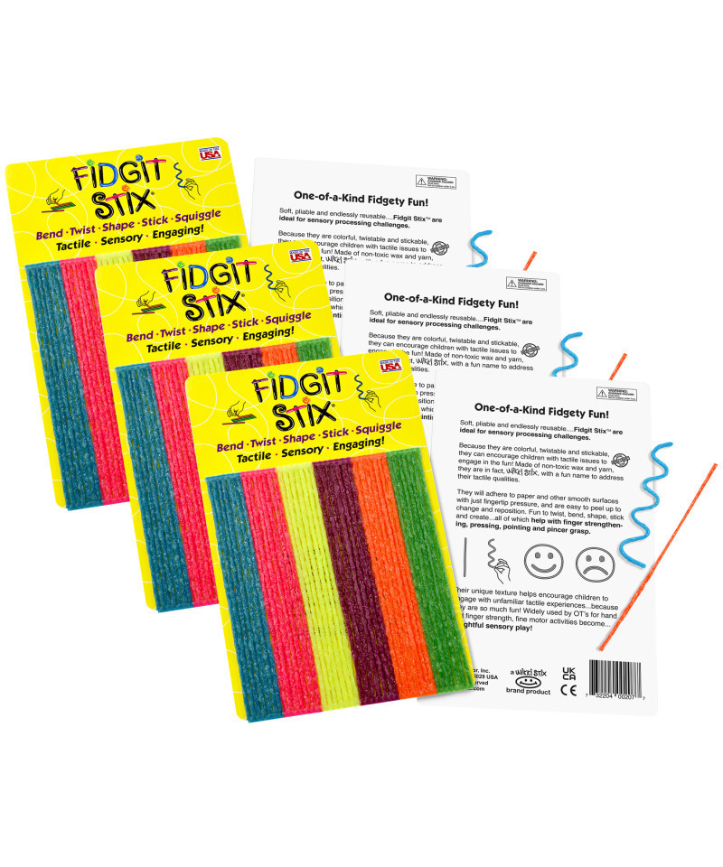Wikki Stix are ideal for tactile learning. For example, they can be used to demonstrate math concepts (more/less), and prepositional awareness (over, under). They are ideal for making borders, showing where to start and stop on the paper, and as a border to color within the lines. And as a tactile toy, they provide hands-on creativity with no right or wrong connotation. Soft and pliable, Wikki Stix tactile sensory toys can be used by small fingers for all kinds of fine motor skills and tactile activities, from learning to form letters and numbers to simple grip and finger strengthening exercises. Fidget Stix are great for manual dexterity and tactile learning. Perfect for fine motor activities and sensory play. Each pack includes 42 Fidget Stix. Sold as 3 packs for a total of 126 Fidget Stix.