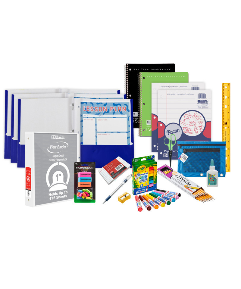 - Kit includes basic school supplies
