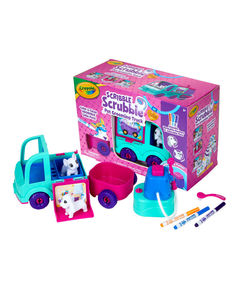 The Scribble Scrubbie Grooming Truck could be rolling into your home soon! This mobile play set is the fun way to take care of your Scribble Scrubbie pets' needs—then just fold it up and roll! All Crayola Scribble Scrubbie pets are washable so you can color & customize with the included markers then wash them and start again. Features 1 Toy Truck with cart and hand-pump hose, 2 Scribble Scrubbie Pets, 3 Washable Markers, and 1 Brush. Ideal birthday or holiday gift for girls and boys. Perfect for kids, ages 3 and up.