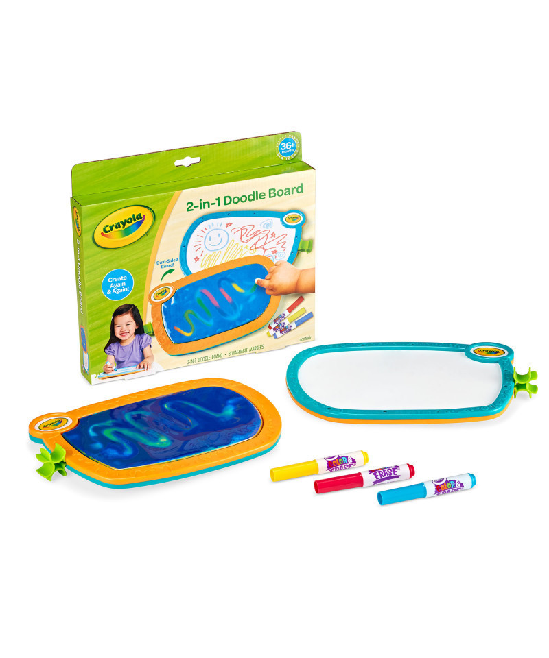 - DOUBLE DOODLE BOARD: Features 1 Double Sided Doodle Board and 3 Washable Markers.
