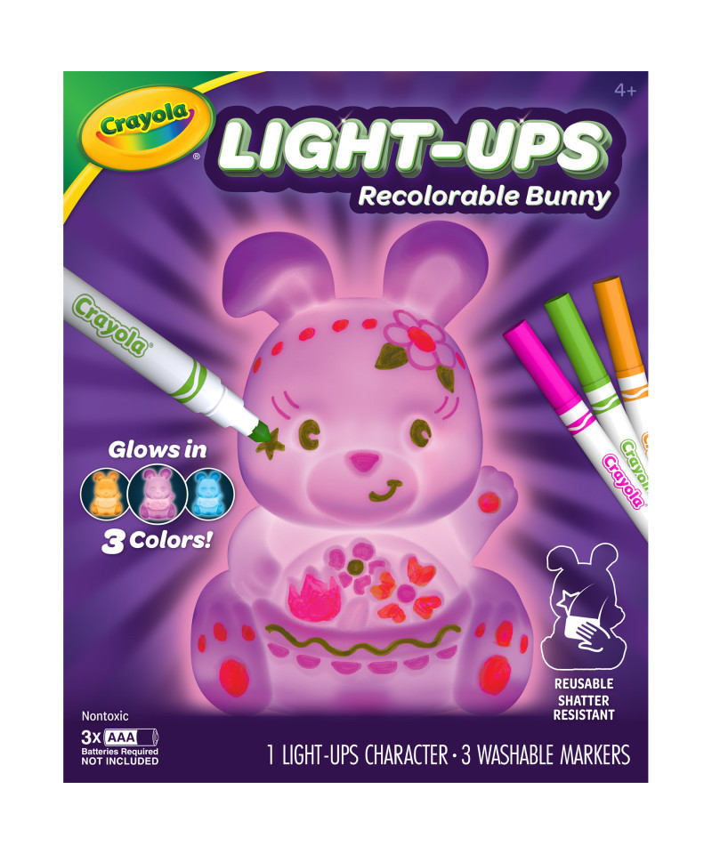 - WHAT'S INCLUDED: Hop into creativity with 1 Recolorable Light-Ups Bunny, 3 Ultra-Clean Washable Markers, and 1 Instruction Sheet (3 AAA batteries required - not included).