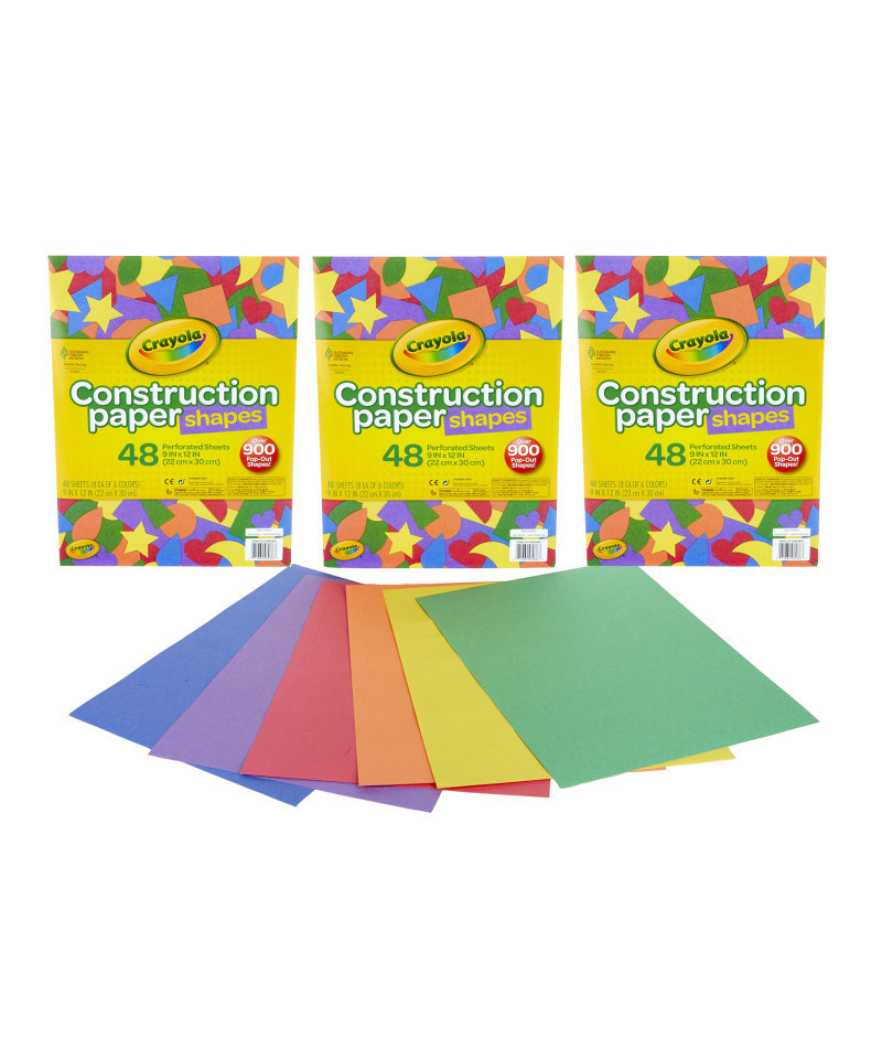 - CRAYOLA CONSTRUCTION PAPER: Sold as 3 packs, each pack includes 48 9" x 12" construction paper sheets with over 900 precut paper shapes, such as hearts, stars, and diamonds.