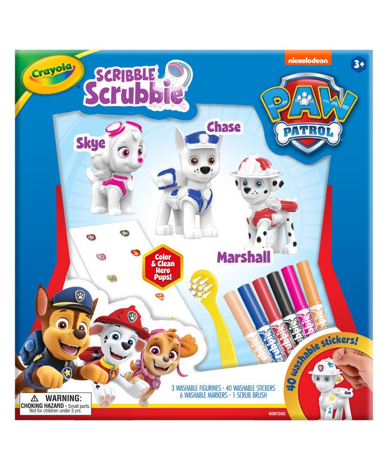 - SCRIBBLE SCRUBBIE PAW PATROL: Features 3 PAW Patrol Scribble Scrubbie Pets, 6 Scribble Scrubbie Washable Markers, 1 Scrub Brush, and 40 Washable Stickers.