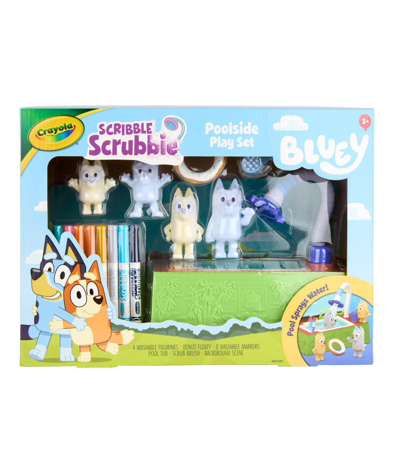- SCRIBBLE SCRUBBIES TOY: This Scribble Scrubbies Bluey Playset features 4 Bluey Characters, 1 Pump Pool, 1 Innertube, 1 Scenic Recolorable Backdrop, 8 Washable Scribble Scrubbie Markers, & 1 Scrub Brush.