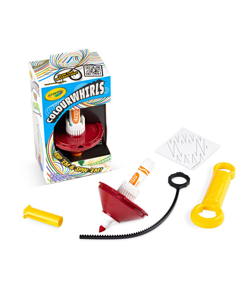 - CRAYOLA COLOURWHIRLS: Compete in a whirlwind battle of creativity with 1 Colourwhirls set, which includes 1 Spinner, 1 Handle, 1 Rip Cord, 1 Adaptor, 1 Marker Holder, 1 Re-Colorable Disc, and 1 Crayola Ultra Clean Marker.