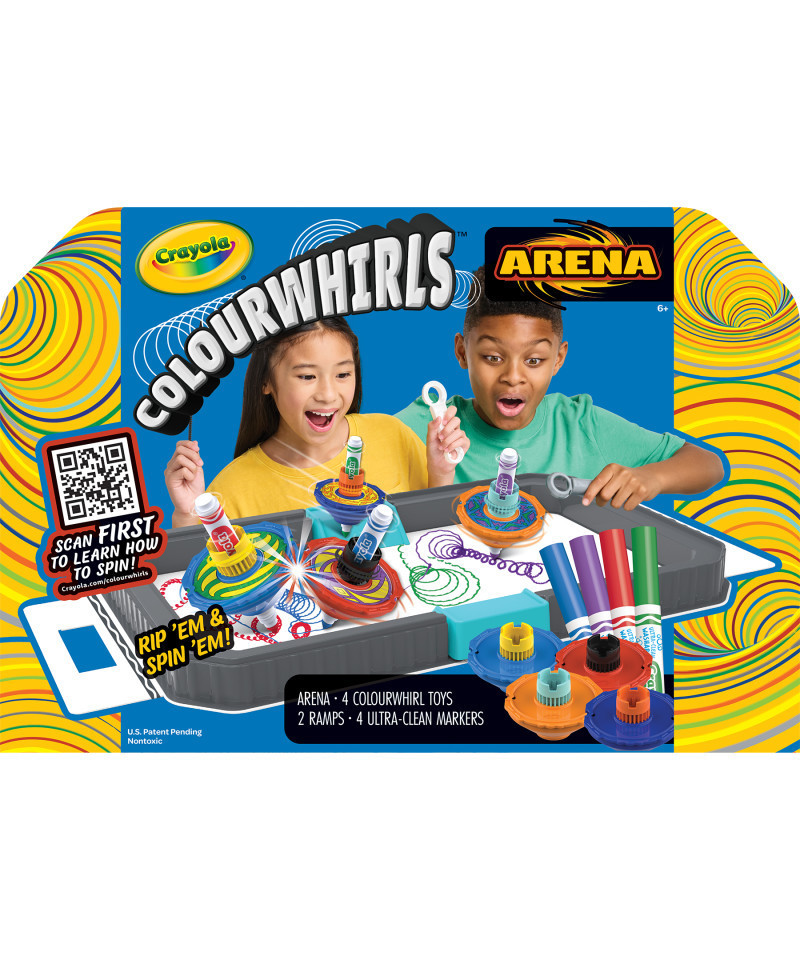 - CRAYOLA COLOURWHIRLS ARENA SET: Includes 1 Arena for 4 players, 4 Colourwhirl toys, 4 Markers, 2 Ramps, and a Carrying Case for colorful fun anywhere.