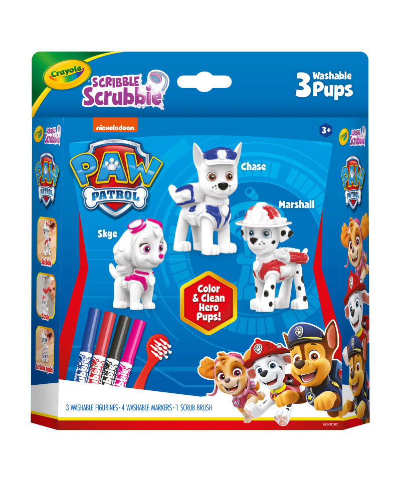 - SCRIBBLE SCRUBBIE PLAYSET: The set includes three favorite PAW Patrol characters: Chase, Marshall, and Skye, as well as 3 washable markers and a scrub brush.