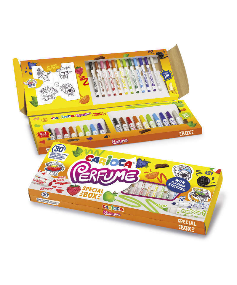 Experience a sensory explosion of color and fragrance with the Carioca Perfume Felt Tip Pens Special Box – 30 Pieces + Stickers. This special pack includes 30 assorted felt tip pens and fun coloring stickers, making it perfect for creative and playful activities. The scented washable ink is crafted from carefully selected aromas to evoke natural essences, free from any allergenic substances for safe use. The set features a variety of pen types: 12 PERFUME felt tip pens with a conical tip for a double stroke, 8 PERFUME STAMPS pens with a double tip (one maxi conical and one stamp), and 10 PERFUME MAXI pens with a maxi conical tip for bold double strokes. Ideal for children and craft enthusiasts, this pack combines creativity, fun, and safety in one delightful package.