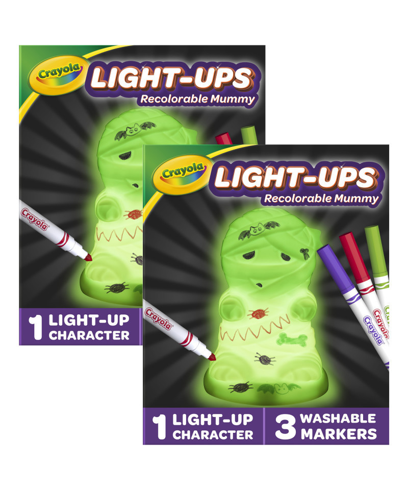 - LIGHT-UPS MUMMY: Pack of 2 kits, each kit includes 1 Light Ups Mummy, 3 Ultra Clean Markers (Red, Green, Plum), and 1 Instruction Sheet.