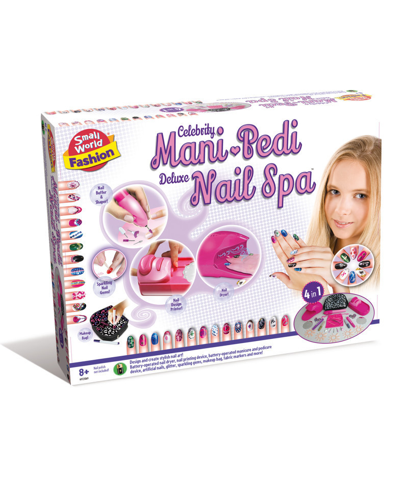 Transform any day into a glamorous spa experience with the Celebrity Mani Pedi Deluxe Nail Spa. This all-in-one nail kit includes three professional-style devices that let you pamper your fingers and toes just like at a salon. Shape your nails, treat your cuticles, buff them to a brilliant shine, then add color and creativity with nail polish, glitter, and unique printed designs. The included nail dryer ensures your manicure or pedicure sets in minutes, making it quick, fun, and easy to achieve flawless nails every time. With everything needed for a complete fashion makeover, this deluxe nail spa is perfect for kids ages 8 and up who love beauty, fashion, and creative play.