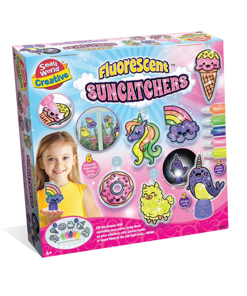 Brighten up any room with the Fluorescent Suncatchers Kit, a fun and creative craft activity for kids ages 4 and up. This engaging DIY set lets children fill unique suncatcher shapes with sparkling neon paint, then display them on windows using suction cup hooks or on glowing LED light bases for a dazzling effect. With 6 suncatcher shapes, 5 bottles of glitter paint, and all supplies included, kids can design colorful decorations that shine beautifully in sunlight or artificial light. Easy-to-follow instructions make this kit perfect for little artists, encouraging creativity, color play, and hands-on fun.