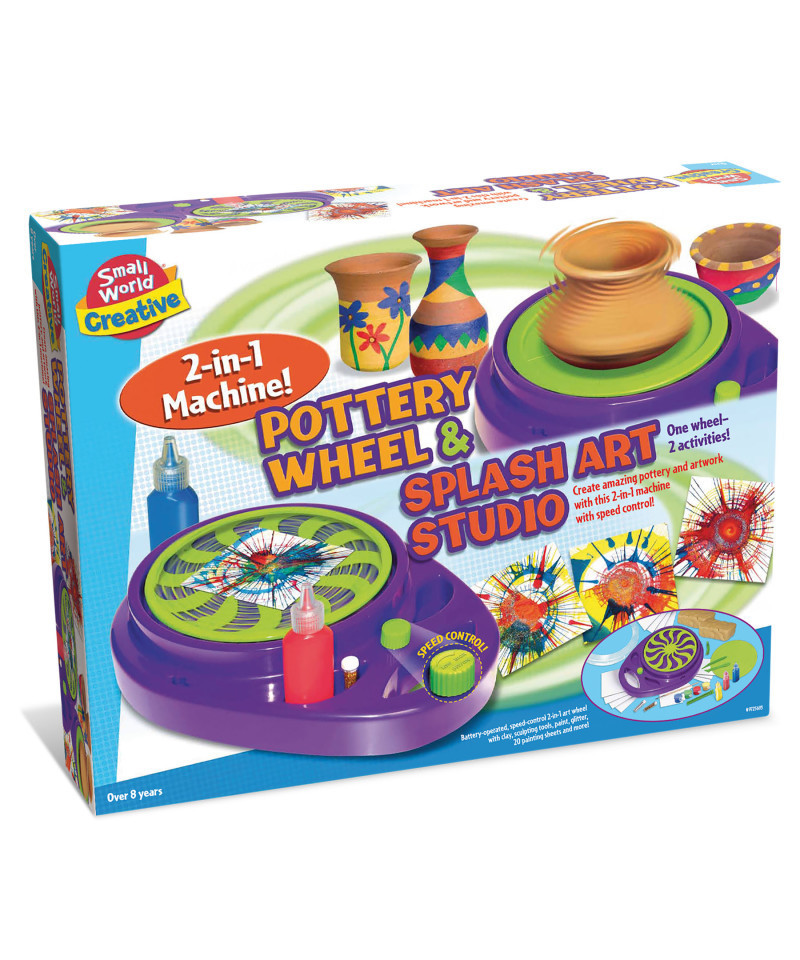 Unleash your creativity with the Pottery Wheel & Splash Art Studio, a versatile 2-in-1 craft set perfect for kids ages 8 and up. This innovative machine lets children sculpt amazing pottery and create vibrant splash art with the same easy-to-use setup. The battery-operated revolving machine features an on/off switch and speed control, and the interchangeable trays allow for seamless transitions between clay and paint projects. The kit includes 2 lbs. of clay, 3 bottles of paint, 4 paint pots, sculpting tools, glitter, paintbrush, and 20 assorted papers, providing all the supplies needed for endless artistic possibilities. With detailed instructions included, the Pottery Wheel & Splash Art Studio encourages fine motor skills, imaginative expression, and hours of creative fun.